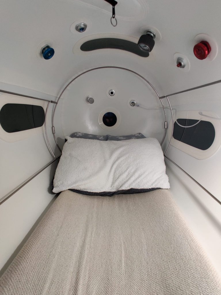 Breath 97% concentrated oxygen at 1.5ata in a relaxing and restorative chamber, all to yourself for an hour.
